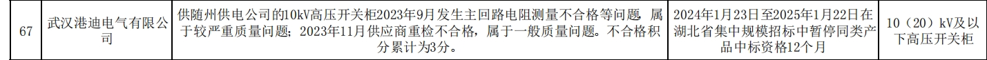 其中,武汉港迪电气有限公司因供随州供电公司的10kV高压开关柜2023年9月发生主回路电阻测量不合格等问题,属于较严重质量问题;2023年11月供应商重检不合格,属于一般质量问题。不合格积分累计为3分。处理措施:2024年1月23日至2025年1月22日在湖北省集中规模招标中暂停同类产品中标资格12个月。处理范围:10(20)kV及以下高压开关柜。