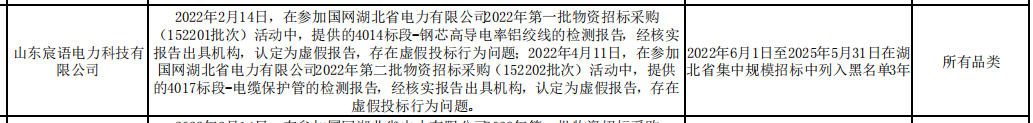 公告显示,山东宸语电力科技有限公司,2022年2月14日,在参加国网湖北省电力有限公司2022年第一批物资招标采购 (152201批次)活动中,提供的4014标段-钢芯高导电率铝绞线的检测报告,经核实报告出具机构,认定为虚假报告,存在虚假投标行为问题;2022年4月11日,在参加国网湖北省电力有限公司2022年第二批物资招标采购(152202批次)活动中,提供的4017标段-电缆保护管的检测报告,经核实报告出具机构,认定为虚假报告,存在虚假投标行为问题。