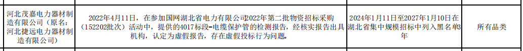 公告显示,河北茂嘉电力器材制造有限公司(原名: 河北捷远电力器材制造有限公司),2022年4月11日,在参加国网湖北省电力有限公司2022年第二批物资招标采购 (152202批次)活动中,提供的4017标段-电缆保护管的检测报告,经核实报告出具机构,认定为虚假报告,存在虚假投标行为问题。