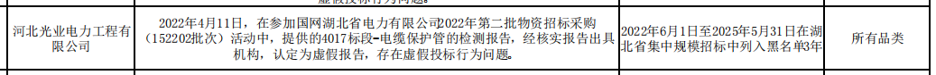 公告显示,河北光业电力工程有限公司,2022年4月11日,在参加国网湖北省电力有限公司2022年第二批物资招标采购 (152202批次)活动中,提供的4017标段-电缆保护管的检测报告,经核实报告出具机构,认定为虚假报告,存在虚假投标行为问题。