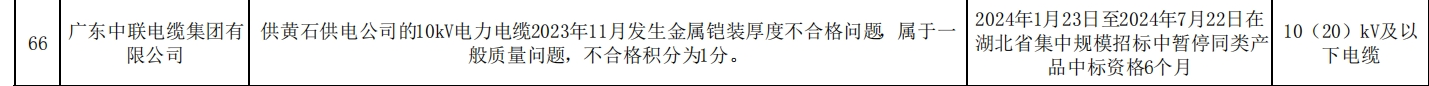 其中,广东中联电缆集团有限公司因供黄石供电公司的10kV电力电缆2023年11月发生金属铠装厚度不合格问题,属于一般质量问题,不合格积分为1分。处理措施:2024年1月23日至2024年7月22日在湖北省集中规模招标中暂停同类产品中标资格6个月。处理范围:10(20)kV及以 下电缆。