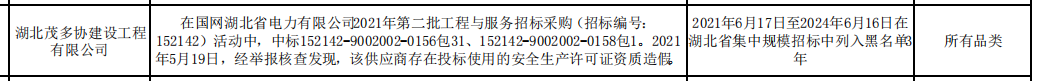 公告显示,湖北茂多协建设工程有限公司,在国网湖北省电力有限公司2021年第二批工程与服务招标采购(招标编号: 152142)活动中,中标152142-9002002-0156包31、152142-9002002-0158包1。2021 年5月19日,经举报核查发现,该供应商存在投标使用的安全生产许可证资质造假。