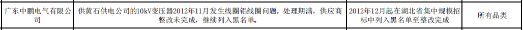 公告显示,广东中鹏电气有限公司,在供黄石供电公司的10kV变压器2012年11月发生线圈铝线圈问题。处理期满,供应商整改未完成,继续列入黑名单。
