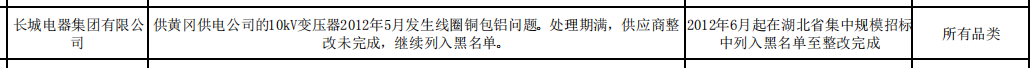 公告显示,长城电器集团有限公司,在供黄冈供电公司的10kV变压器2012年5月发生线圈铜包铝问题。处理期满,供应商整改未完成,继续列入黑名单。