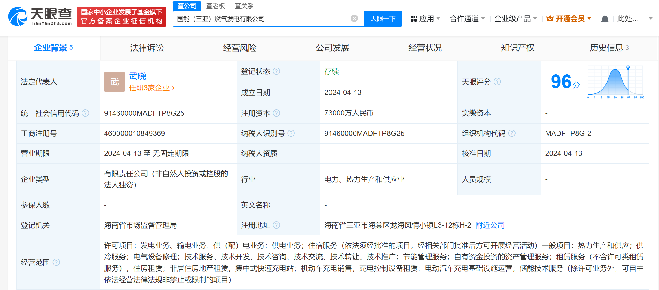 天眼查App显示,近日,国能(三亚)燃气发电有限公司成立,法定代表人为武晓,注册资本7.3亿人民币,经营范围含热力生产和供应、供冷服务、电气设备修理、节能管理服务、自有资金投资的资产管理服务、集中式快速充电站、储能技术服务等。股权全景穿透图显示,该公司由国家能源集团海南电力有限公司全资持股,后者为国电电力(600795)全资子公司。