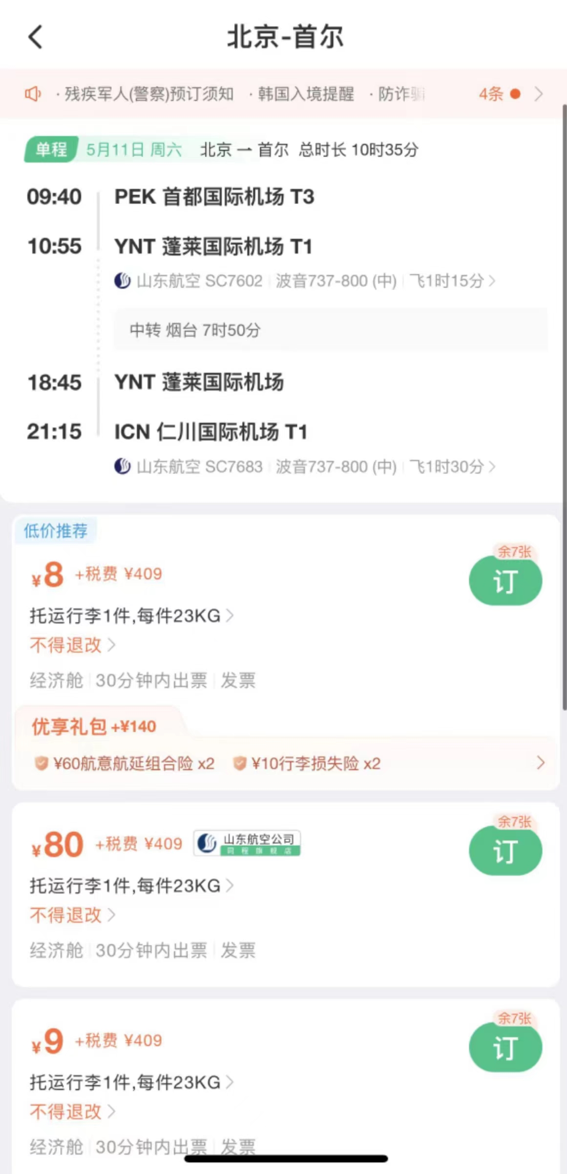 中新网5月9日电 “五一”节前机票价格临时跳水,节后机票价格继续下降。在线旅行平台数据显示,假期后第一周,国内机票价格较假期高峰时段下降近两成,国际机票均价较节中下降超过一成。5月11日北京飞往首尔的一趟航班机票(不含税)价格低至8元。以银发族和大学生群体为主的“错峰游”人群纷纷选择在节后出行。