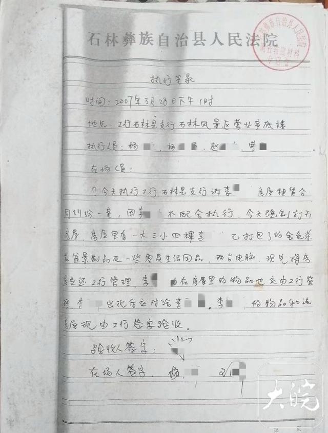 记者注意到,石林彝族自治县人民法院2007年3月28日的执行笔录显示,工行石林支行诉李女士房屋租赁合同纠纷一案,因李女士不配合执行,当天强制打开房屋,屋内有“一大三小”四棵已打包的金色茶花盆景制品以及一些生活用品,交由工行管理。文中还明确提到,李女士出现后会交付给她,且李女士的物品由工行签字验收,下面还附上了验收人和在场人的签名。