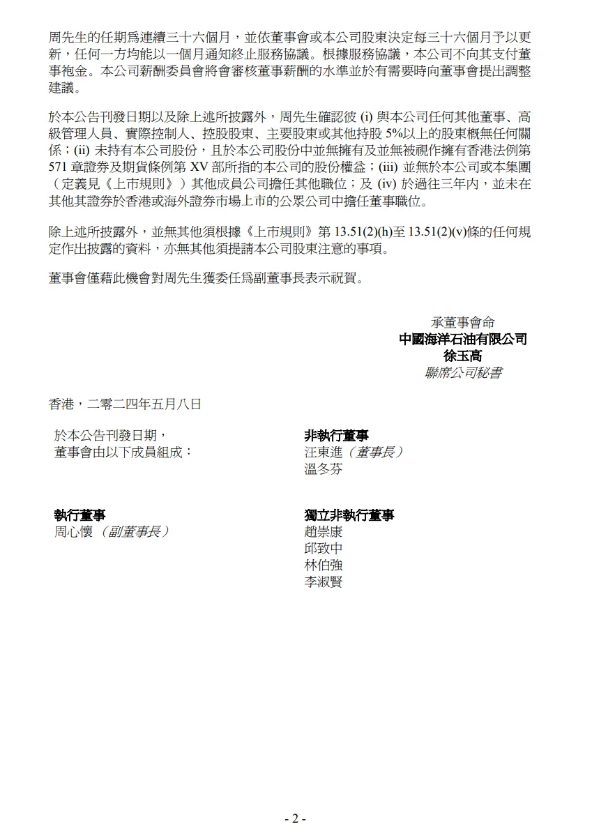 5月8日,中国海洋石油发布公告称,自2024年5月8日起,公司执行董事周心怀获委任为公司副董事长。