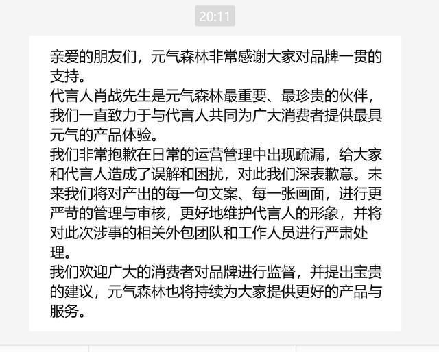 元气森林今日晚间对此致歉,称代言人肖战先生是元气森林最重要、最珍贵的伙伴,公司一直致力于与代言人共同为广大消费者提供最具元气的产品体验。