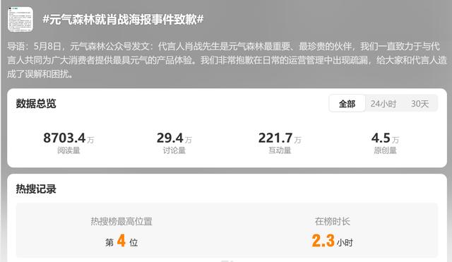 5月8日消息,元气森林致歉一事引发大众关注,相关话题登上微博热搜榜,话题阅读量8703.4万,互动量221.7万,在榜时长2.3小时。
