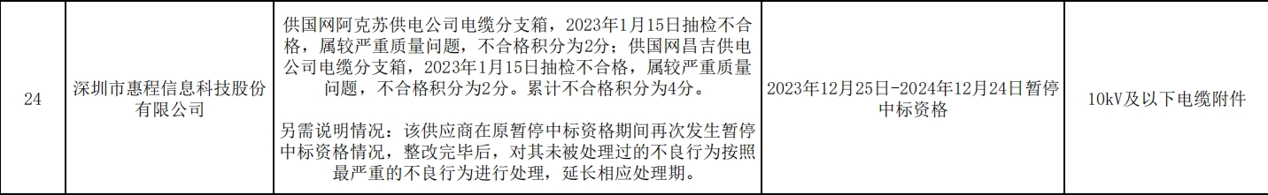 其中,深圳市惠程信息科技股份有限公司供国网阿克苏供电公司电缆分支箱,2023年1月15日抽检不合格,属较严重质量问题,不合格积分为2分;供国网昌吉供电公司电缆分支箱,2023年1月15日抽检不合格,属较严重质量问题,不合格积分为2分。累计不合格积分为4分。另需说明情况:该供应商在原暂停中标资格期间再次发生暂停中标资格情况,整改完毕后,对其未被处理过的不良行为按照最严重的不良行为进行处理,延长相应处理期。处理措施:2023年12月25日-2024年12月24日暂停中标资格。处理范围:10kV及以下电缆附件。