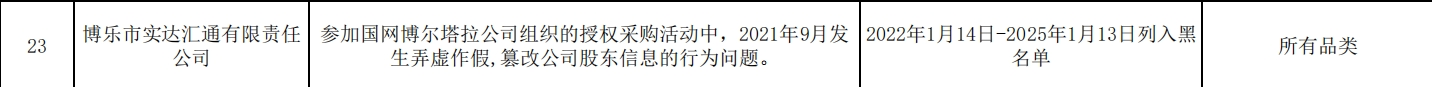 其中,博乐市实达汇通有限责任公司参加国网博尔塔拉公司组织的授权采购活动中,2021年9月发生弄虚作假,篡改公司股东信息的行为问题。处理措施:2022年1月14日-2025年1月13日列入黑名单。处理范围:所有品类。