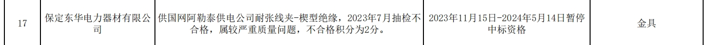 其中,保定东华电力器材有限公司因供国网阿勒泰供电公司耐张线夹-楔型绝缘,2023年7月抽检不合格,属较严重质量问题,不合格积分为2分。处理措施:2023年11月15日-2024年5月14日暂停中标资格。处理范围:金具。