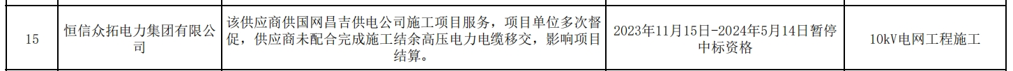 其中,恒信众拓电力集团有限公司因供国网昌吉供电公司施工项目服务,项目单位多次督促,供应商未配合完成施工结余高压电力电缆移交,影响项目结算。处理措施:2023年11月15日-2024年5月14日暂停中标资格。处理范围:10kV电网工程施工。