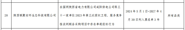 其中,在国网陕西省电力有限公司咸阳供电公司等三十一家单位2023年第三次授权工程、服务竞争性谈判联合采购项目中,陕西联聚安环生态科技有限公司存在串通投标行为。处理措施:2024年5月1日-2027年4月30日列入黑名单3年。处理范围:所有品类。