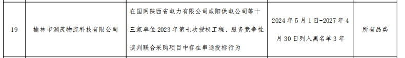 其中,在国网陕西省电力有限公司咸阳供电公司等十三家单位2023年第七次授权工程、服务竞争性谈判联合采购项目中,榆林市渊茂物流科技有限公司存在串通投标行为。处理措施:2024年5月1日-2027年4月30日列入黑名单3年。处理范围:所有品类。