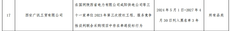 其中,在国网陕西省电力有限公司咸阳供电公司等三十一家单位2023年第三次授权工程、服务竞争性谈判联合采购项目中,西安广讯工贸有限公司存在串通投标行为。处理措施:2024年5月1日-2027年4月30日列入黑名单3年。处理范围:所有品类。