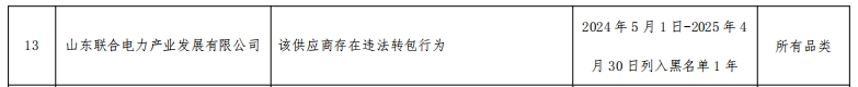 其中,山东联合电力产业发展有限公司存在违法转包行为。处理措施:2024年5月1日-2025年4月30日列入黑名单1年。处理范围:所有品类。
