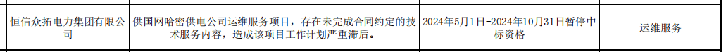 公告显示,恒信众拓电力集团有限公司,供国网哈密供电公司运维服务项目,存在未完成合同约定的技术服务内容,造成该项目工作计划严重滞后。
