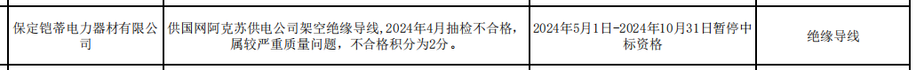公告显示,保定铠蒂电力器材有限公司,供国网阿克苏供电公司架空绝缘导线,2024年4月抽检不合格,属较严重质量问题,不合格积分为2分。