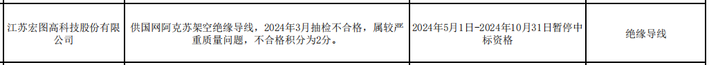 公告显示,江苏宏图高科技股份有限公司,供国网阿克苏架空绝缘导线,2024年3月抽检不合格,属较严重质量问题,不合格积分为2分。