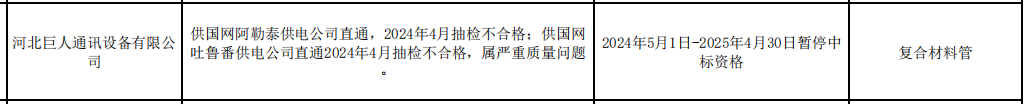 公告显示,河北巨人通讯设备有限公司,供国网阿勒泰供电公司直通,2024年4月抽检不合格;供国网吐鲁番供电公司直通2024年4月抽检不合格,属严重质量问题。