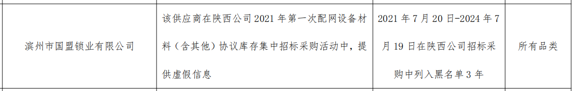 公告显示,滨州市国盟锁业有限公司,该供应商在陕西公司 2021 年第一次配网设备材料(含其他)协议库存集中招标采购活动中,提供虚假信息。