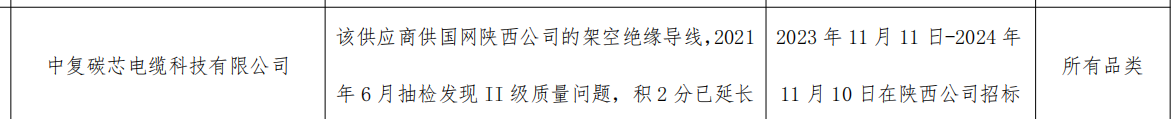 公告显示,中复碳芯电缆科技有限公司,该供应商供国网陕西公司的架空绝缘导线,2021 年 6 月抽检发现 II 级质量问题,积 2 分已延长挂网 1 年,验收仍未通过。