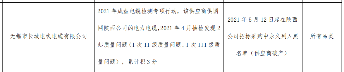 公告显示,无锡市长城电线电缆有限公司,在2021 年成盘电缆检测专项行动,该供应商供国网陕西公司的电力电缆,2021 年 4 月抽检发现 2 起质量问题(1 次 II 级质量问题、1 次 III 级质量问题),累计积 3 分。