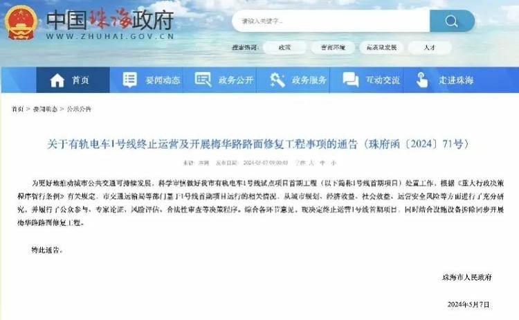 珠海市上述《通告》指出,基于1号线首期项目运行的相关情况,从城市规划、经济效益、社会效益、运营安全风险等方面进行了充分研究,并履行了公众参与、专家论证、风险评估、合法性审查等决策程序,综合各环节意见,决定终止运营1号线首期项目,同时结合设施设备拆除同步开展梅华路路面修复工程。