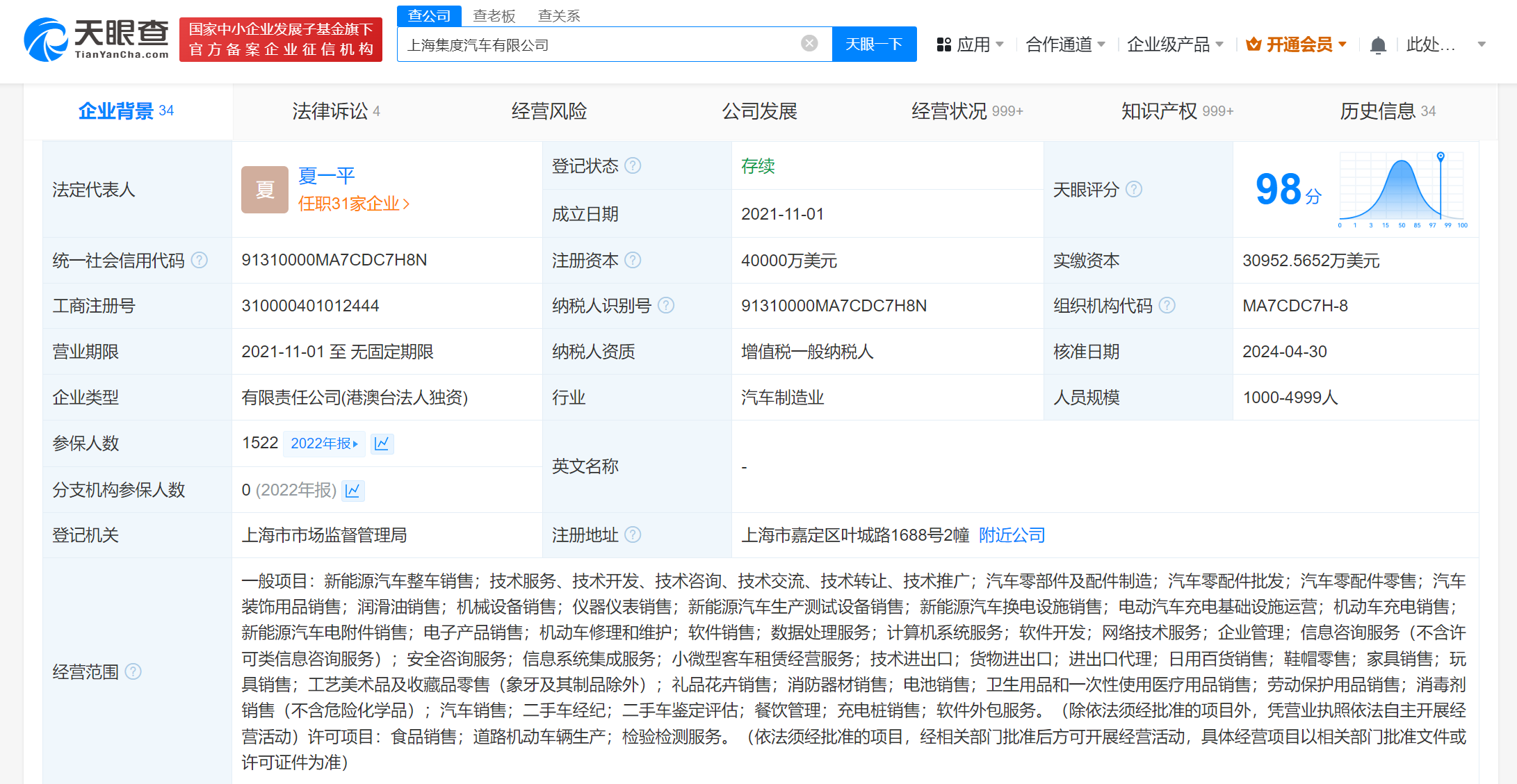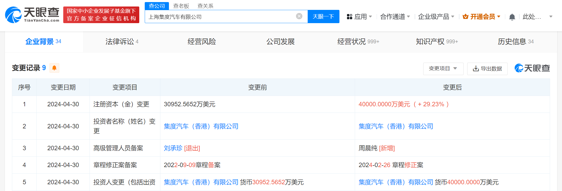天眼查App显示,近日,极越汽车关联公司上海集度汽车有限公司发生工商变更,注册资本由约3.1亿美元增至4亿美元。