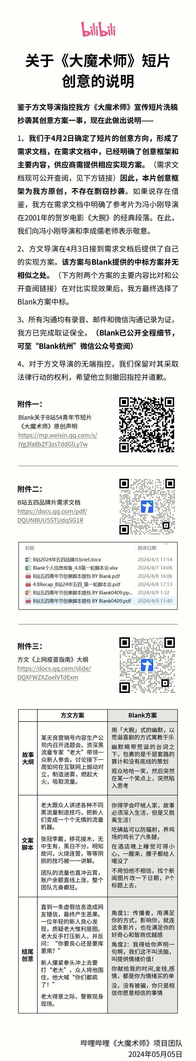 5月5日,B站《大魔术师》团队曾公开回应方文称,创意框架为其原创,不存在剽窃抄袭。方文导演的方案和中标方案没有相似之处,希望方文立刻撤回指控并道歉。