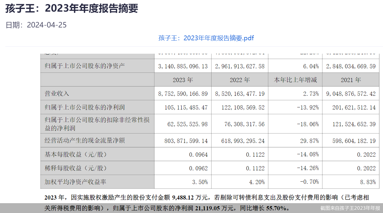 5月7日,孩子王方面在接受北京商报记者采访时表示,2021年、2022年,受宏观环境影响,公司净利润有所下降。2023年,公司剔除可转债利息支出及股份支付费用的影响(已考虑相关所得税费用的影响),归属净利润约为2.11亿元,同比增长55.7%。