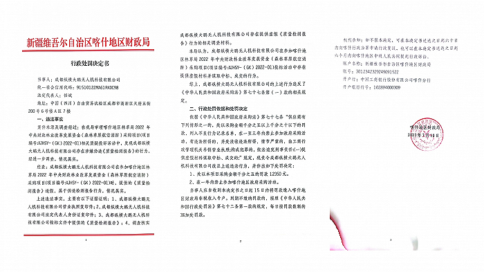 在声明中,远度科技披露了2023年7月10日喀什地区财政局公布的《行政处罚决定书》,认定纵横无人机伪造质量检测报告,在一年内禁止其参加喀什地区政府采购活动。根据《财政部关于规范政府采购行政处罚有关问题的通知》,各级人民政府财政部门依法作出的禁止供应商参加政府采购活动等行政处罚决定,在全国范围内生效。