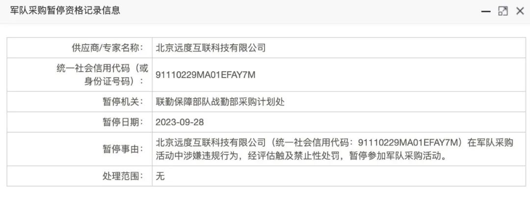 不过,根据军队采购网公告显示,因在军队采购活动中涉嫌违规行为,经评估触及禁止性处罚,联勤保障部队战勤部采购计划处曾于2023年9月28日暂停北京远度参加军队采购活动。