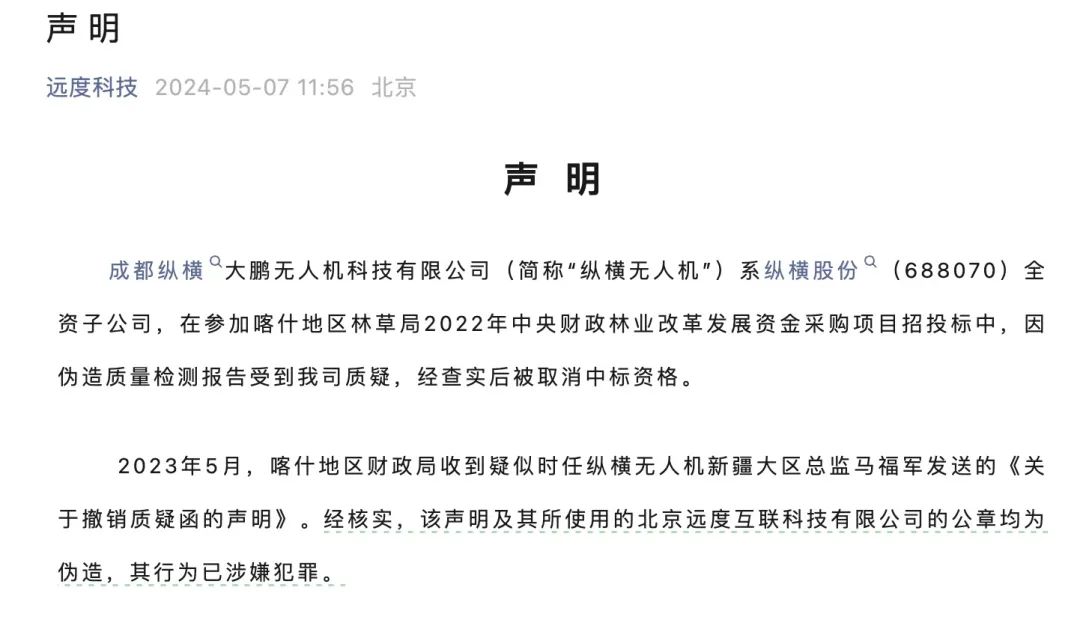上述声明进一步指出,2023年5月,喀什地区财政局收到疑似时任纵横无人机新疆大区总监马福军发送的《关于撤销质疑函的声明》。经核实,该《关于撤销质疑函的声明》及其所使用的北京远度互联科技有限公司的公章均为伪造,其行为已涉嫌犯罪。2023年7月10日,喀什地区财政局公布《行政处罚决定书》,认定纵横无人机伪造质量检测报告,在一年内禁止其参加喀什地区政府采购活动。