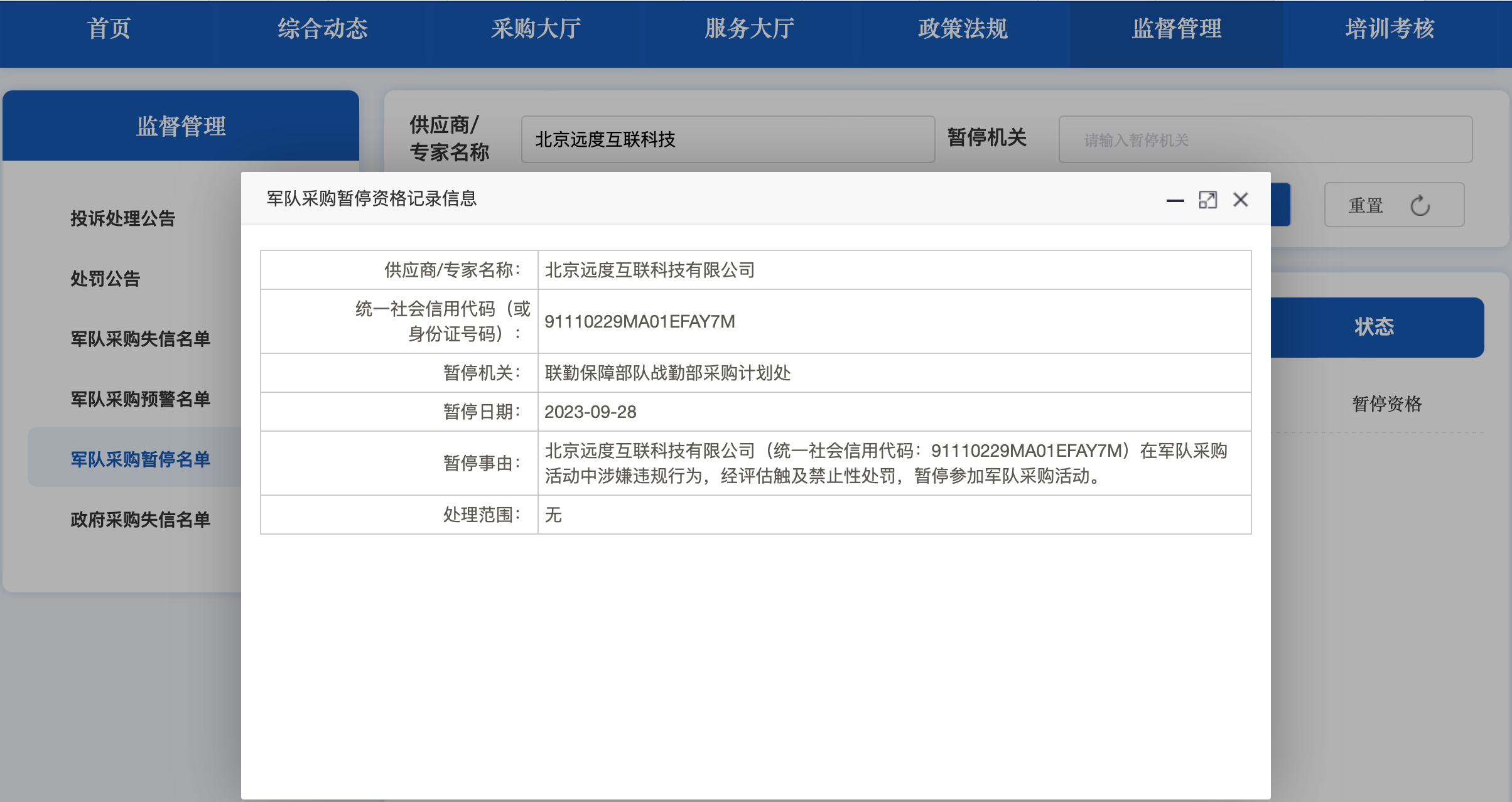 值得注意的是,《科创板日报》记者通过查询军队采购网信息注意到,北京远度互联科技有限公司名列军队采购暂停名单中,起始时间为2023年9月28日,暂停事由为该公司在军队采购活动中涉嫌违规行为,经评估触及禁止性处罚,暂停参加军队采购活动。