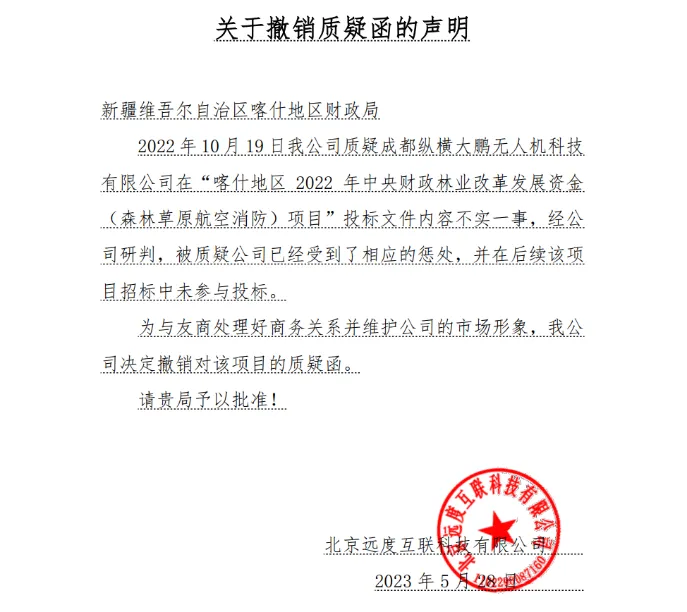 关于远度科技在声明中提及的大鹏无人机被喀什地区政府禁止参与采购活动一事,《科创板日报》记者在喀什地区财政局出具的《撤销行政处罚决定书》中注意到,喀什地区财政局在2023年7月10日向大鹏无人机做出罚款12350元及“在一年内禁止参加喀什地区政府采购活动”的行政处罚。