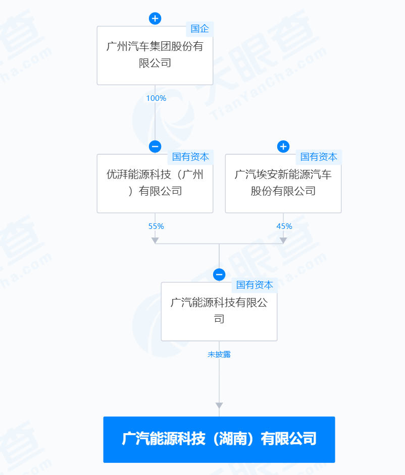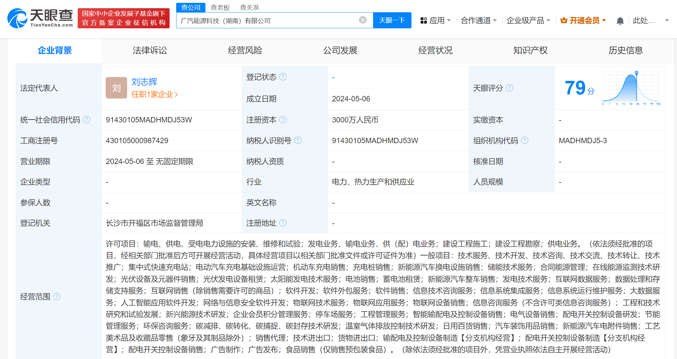 天眼查App显示,近日,广汽能源科技(湖南)有限公司成立,法定代表人为刘志辉,注册资本3000万人民币,经营范围含集中式快速充电站、电动汽车充电基础设施运营、机动车充电销售、充电桩销售、新能源汽车换电设施销售、储能技术服务等。股东信息显示,该公司由广汽集团(601238)旗下广汽能源科技有限公司全资持股。