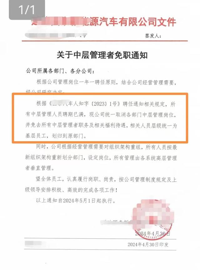 ▲某新能源汽车公司发布关于中层管理者免职的通知