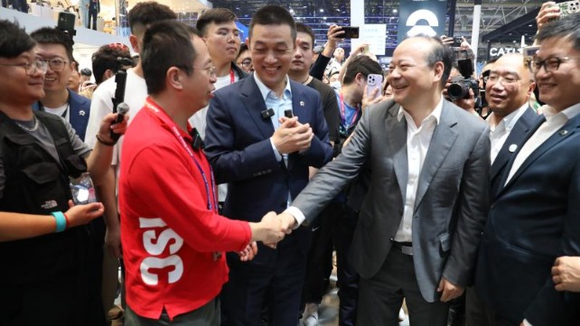 2024北京车展焦点“红衣大叔”周鸿祎和宁德时代董事长曾毓群互动。记者史丽摄