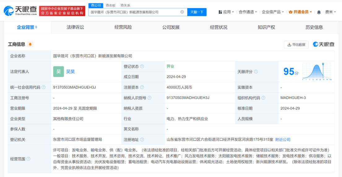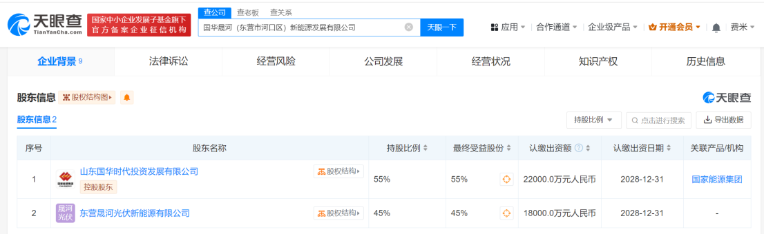 天眼查App显示,近日,国华晟河(东营市河口区)新能源发展有限公司成立,法定代表人为吴昊,注册资本4亿人民币,经营范围含风力发电技术服务、太阳能发电技术服务、储能技术服务、供冷服务、光伏发电设备租赁、蓄电池租赁等。股东信息显示,该公司由国家能源集团旗下山东国华时代投资发展有限公司、东营晟河光伏新能源有限公司分别持股55%、45%。