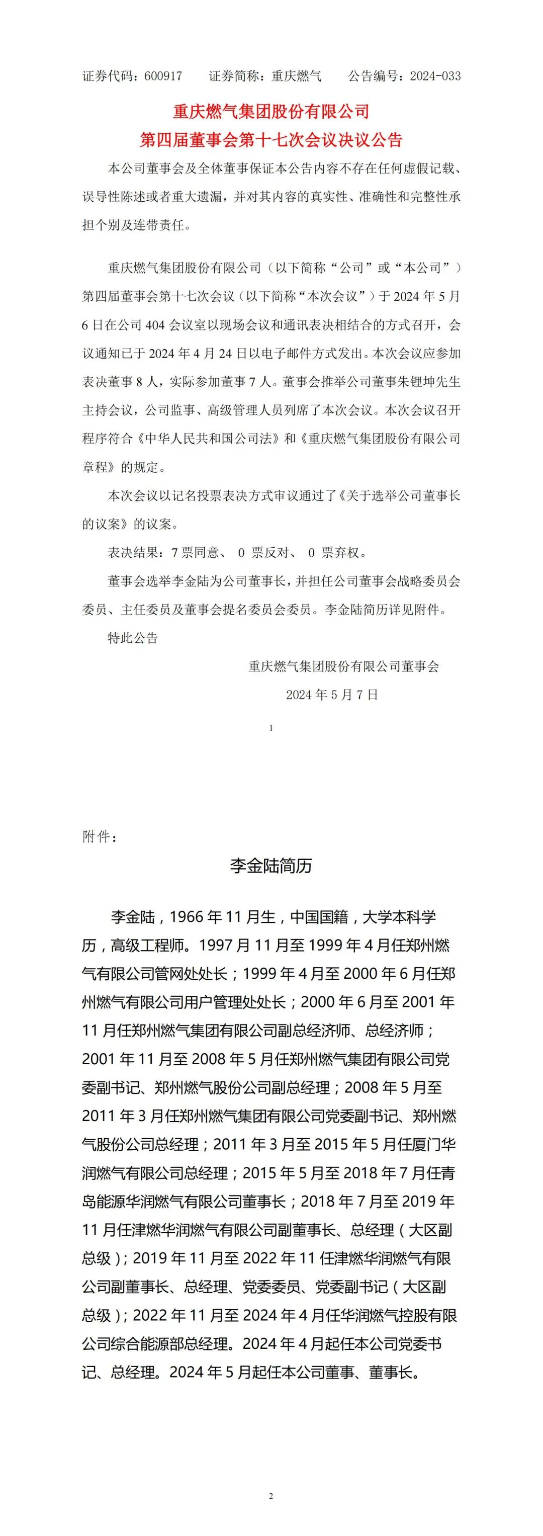 重庆燃气集团股份有限公司发布公告称,5月6日,公司召开第四届董事会第十七次会议,选举李金陆为公司董事长,并担任公司董事会战略委员会委员、主任委员及董事会提名委员会委员。