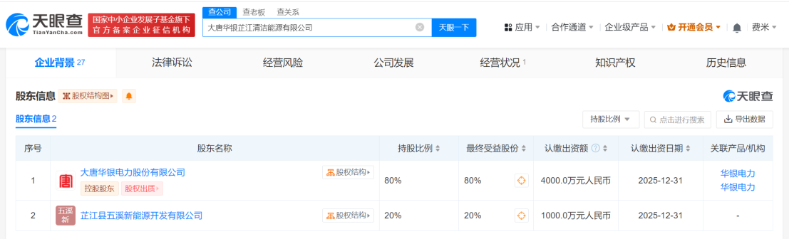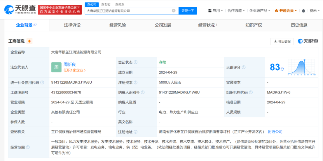 天眼查App显示,近日,大唐华银芷江清洁能源有限公司成立,法定代表人为周新良,注册资本5000万人民币,经营范围含风力发电技术服务、发电业务、输电业务、供(配)电业务等。股东信息显示,该公司由华银电力(600744)、芷江县五溪新能源开发有限公司分别持股80%、20%。