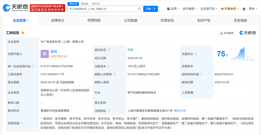 天眼查App显示,近日,中广核金凯科技(上海)有限公司成立,法定代表人为蒋琦,注册资本1843万人民币,经营范围含橡胶制品制造,塑料制品制造,金属材料制造,第一类医疗器械生产,电线、电缆制造,民用核材料生产等。股东信息显示,该公司由中广核技(000881)旗下中广核辐照技术有限公司全资持股。