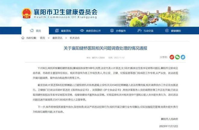 针对健桥医院被举报,去年11月12日,襄阳市卫健委发文回应,截至目前,叶某芝等6名犯罪嫌疑人已被检察机关批准逮捕,公安机关另对4名犯罪嫌疑人依法刑事拘留,相关调查侦办工作正在加紧进行。卫健部门已依法吊销叶某芝的《医师执业证书》、刘某静的《护士执业证书》,其他涉案医务人员的调查处理工作正在开展;已依法取消健桥医院出生医学证明签发资格、母婴保健技术服务执业资格。纪检监察机关对相关领导干部和公职人员失职失责行为、违纪违法问题迅速开展调查,已对13名相关责任人立案审查。