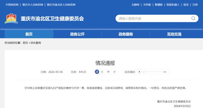 就此,当日,重庆市渝北区卫健委发布情况通报称:“针对网上反映重庆安琪儿妇产医院涉嫌参与代孕一事,我委高度重视,立即成立调查组,调查核实相关情况。一经查实,将依法依规严肃处理。”