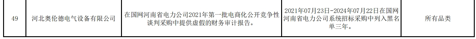 其中,河北奥伦德电气设备有限公司在国网河南省电力公司2021年第一批电商化公开竞争性 谈判采购中提供虚假的财务审计报告。处理措施:2021年07月23日-2024年07月22日在国网河南省电力公司系统招标采购中列入黑名单三年。处理范围:所有品类。