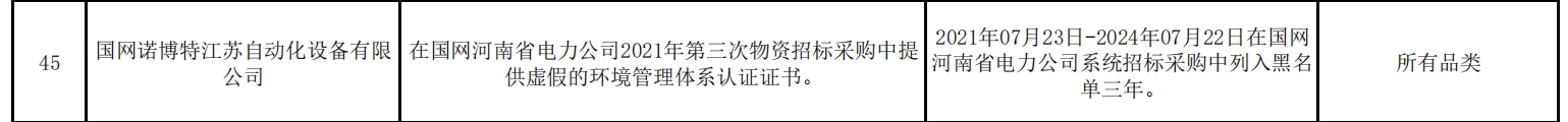 其中,国网诺博特江苏自动化设备有限公司在国网河南省电力公司2021年第三次物资招标采购中提供虚假的环境管理体系认证证书。处理措施:2021年07月23日-2024年07月22日在国网河南省电力公司系统招标采购中列入黑名单三年。处理范围:所有品类。