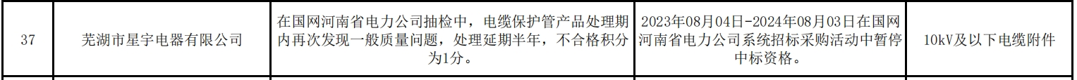 其中,芜湖市星宇电器有限公司因在国网河南省电力公司抽检中,电缆保护管产品处理期内再次发现一般质量问题,处理延期半年,不合格积分为1分。处理措施:2023年08月04日-2024年08月03日在国网河南省电力公司系统招标采购活动中暂停中标资格。处理范围:10kV及以下电缆附件。